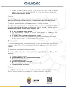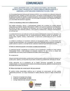 La Universidad Nacional Autónoma de Honduras (UNAH), en su calidad de institución rectora del pensamiento crítico y jurídico del país, emitió un comunicado en el que alerta que la nulidad electoral solo puede proceder cuando exista una prueba plena, objetiva y determinante de fraude estructural. Según la institución, la solicitud de nulidad presentada recientemente carece de fundamentos que cumplan con esos requisitos.