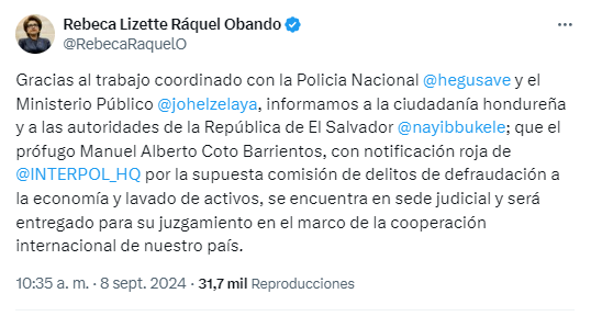 Señaló que Coto Barrientos se encuentra en sede judicial hondureña y será entregado para su juzgamiento en el marco de la cooperación internacional.