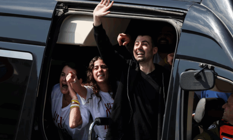 Los rehenes liberados, que fueron secuestrados durante el mortal ataque del 7 de octubre de 2023 por Hamas y llevados a Gaza, se sientan en un vehículo en el Centro Médico Sheba.