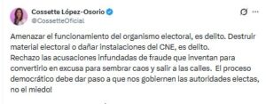 La consejera del Consejo Nacional Electoral (CNE), Cossette López, se pronunció con firmeza ante los recientes señalamientos de presunto fraude en el proceso electoral. A través de un mensaje público, López calificó las acusaciones como “infundadas” y aseguró que forman parte de una estrategia para generar inestabilidad y crear un clima de desconfianza en las instituciones democráticas.