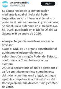La postura de Hall fue expuesta a través de un mensaje público en su cuenta oficial de X, en el que dejó claro que el CNE no tiene competencia legal ni constitucional para ejecutar lo solicitado, al tratarse de actos electorales que ya adquirieron firmeza tras la declaratoria oficial de elecciones, emitida conforme al ordenamiento jurídico vigente.
