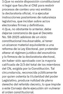 Esta circunstancia, añadió, ha sido incluso reconocida públicamente por el propio presidente del Congreso Nacional, lo que refuerza la imposibilidad jurídica de que el CNE ejecute el decreto sin violentar el orden constitucional.