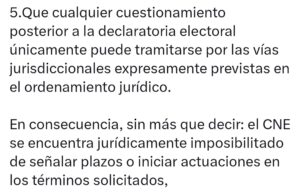 “En consecuencia, el CNE se encuentra jurídicamente imposibilitado de señalar plazos o iniciar actuaciones en los términos solicitados”, concluyó Hall, marcando una postura firme en defensa de la legalidad electoral y la autonomía institucional del Consejo Nacional Electoral.