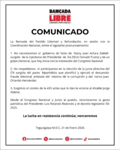 La bancada del Partido Libertad y Refundación (Libre) informó este miércoles que se mantendrá al margen de la votación para elegir la Junta Directiva Provisional del Congreso Nacional, reiterando además que no reconoce al gobierno electo encabezado por Nasry Asfura.