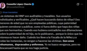 A través de un mensaje en la red social X, López señaló que los sistemas del Registro Nacional de las Personas (RNP) son auditables y permiten identificar a cada usuario que accede a datos sensibles, por lo que —afirmó— la búsqueda de información sobre menores no fue accidental ni anónima.