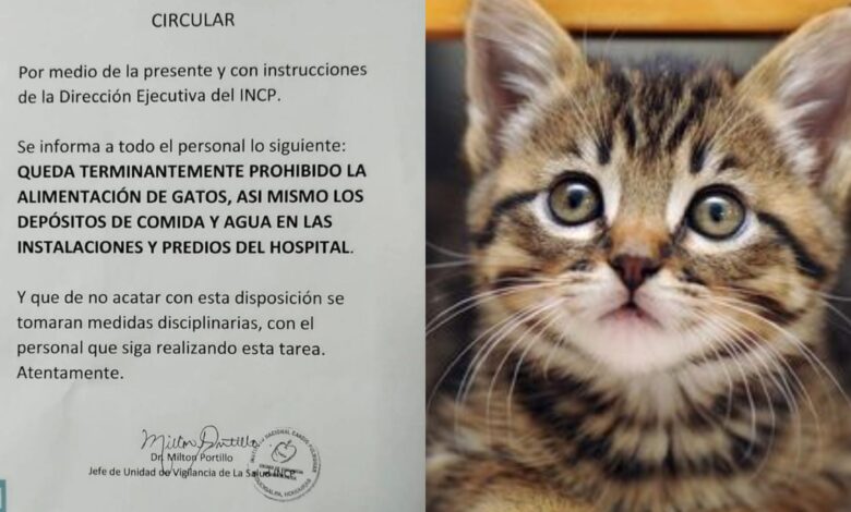 Sin embargo, una circular del Instituto Nacional Cardiopulmonar prohíbe alimentar gatos dentro de sus instalaciones y advierte sanciones disciplinarias para quien lo haga.