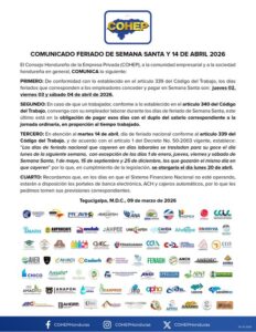 Con la proximidad de la Semana Santa 2026, el Consejo Hondureño de la Empresa Privada (Cohep) confirmó los días de asueto correspondientes a esta celebración y recordó a empresas y trabajadores la obligación de cumplir con lo establecido en la legislación laboral.