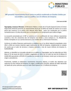 El Ministerio Público a través de la Fiscalía Especial Contra el Crimen Organizado (FESCCO) presentó un requerimiento fiscal por el delito de lavado de activos en la causa penal que involucra al ex policía Juan Manuel Ávila Meza, quien fue condenado por la justicia norteamericana a 12 años de prisión por su vinculación en la conspiración para traficar drogas.