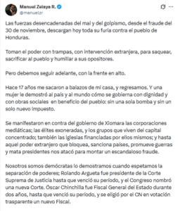 En su mensaje, Zelaya aseguró que “las fuerzas del mal y del golpismo” han retomado el control del poder mediante fraude electoral e injerencia extranjera, acusando directamente a sectores políticos y económicos de buscar desestabilizar al país. Según el exmandatario, estas acciones tienen como objetivo “saquear, sacrificar al pueblo y humillar a sus opositores”.