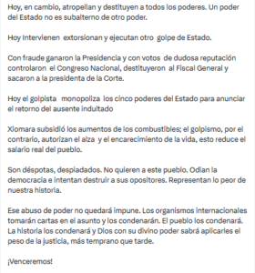 “El pueblo los condenará. La historia los condenará”, concluyó en su mensaje, reiterando su postura frente a lo que considera una grave crisis democrática.