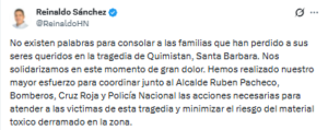 “No existen palabras para consolar a las familias que han perdido a sus seres queridos en la tragedia de Quimistán, Santa Bárbara. Nos solidarizamos en este momento de gran dolor”, manifestó el funcionario.