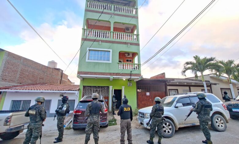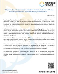 El Ministerio Público a través de la Fiscalía Especial Contra el Crimen Organizado (FESCCO) y la Dirección de Lucha Contra el Narcotráfico (DLCN) con apoyo de las Fuerzas Armadas efectúan ocho allanamientos de morada y cuatro inspecciones relacionadas a las presuntas actividades de narcotráfico y lavado de activos de dos organizaciones delictivas que operan en Olancho y El Paraíso.