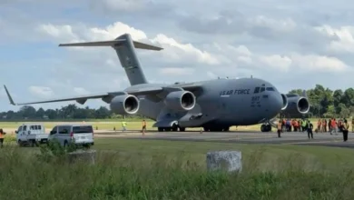 Al Aeropuerto Ramón Villeda Morales de San Pedro Sula llega avión Boeing C-17 Globmaster III de la Fuerza Aérea de Estados Unidos con los primeros 72 migrantes hondureños deportados por parte de la administración de Donald Trump